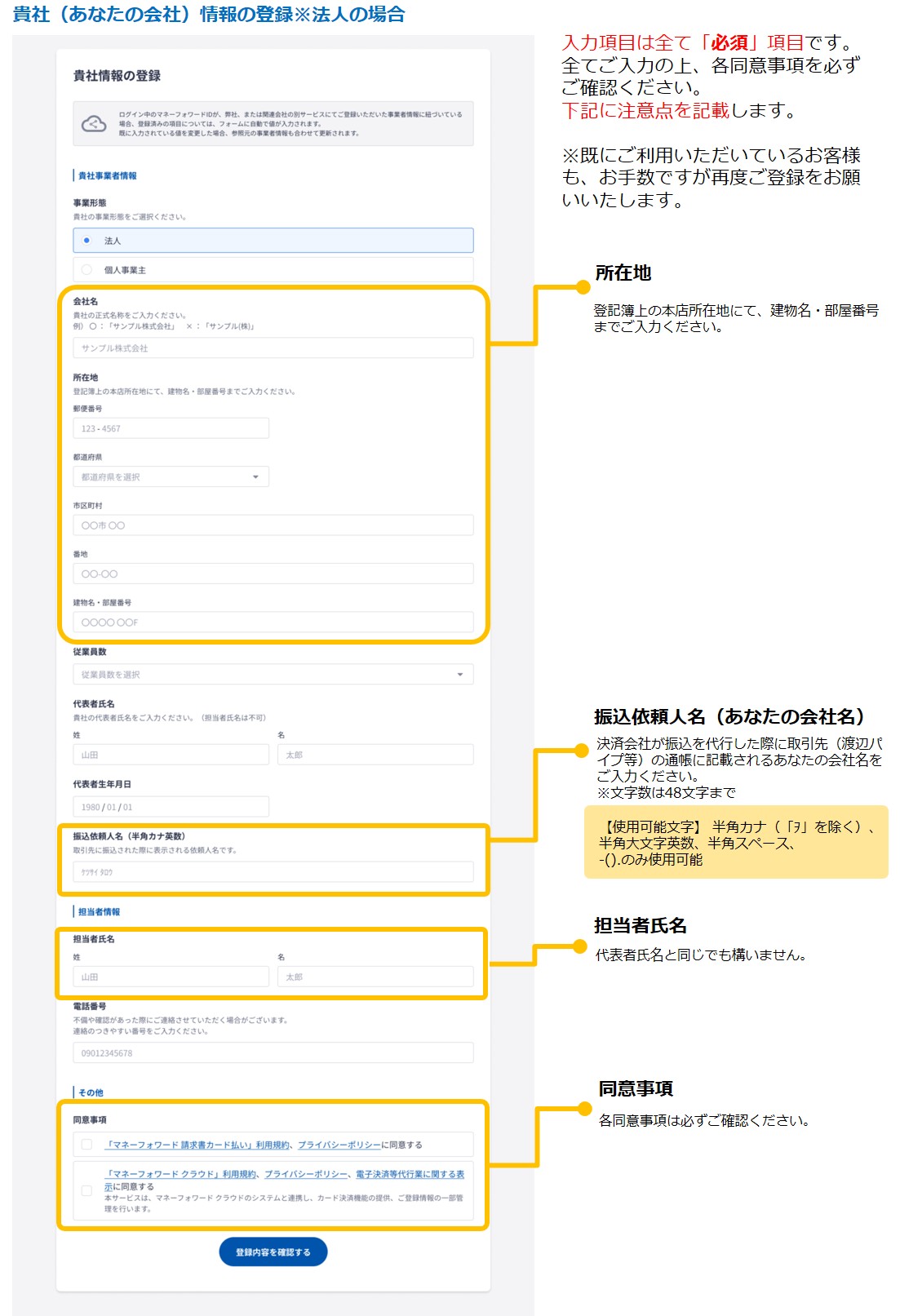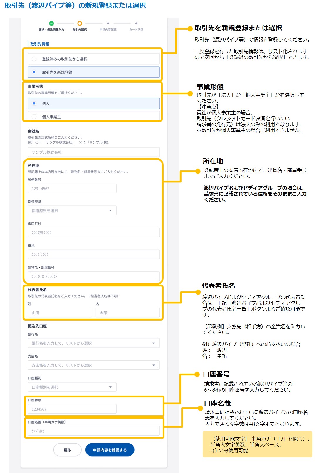 ※請求書(上記、担当営業所情報欄)に記載されている支払先(相手方)の情報をご入力ください(渡辺パイプ、セディア関連会社の請求書の場合)。