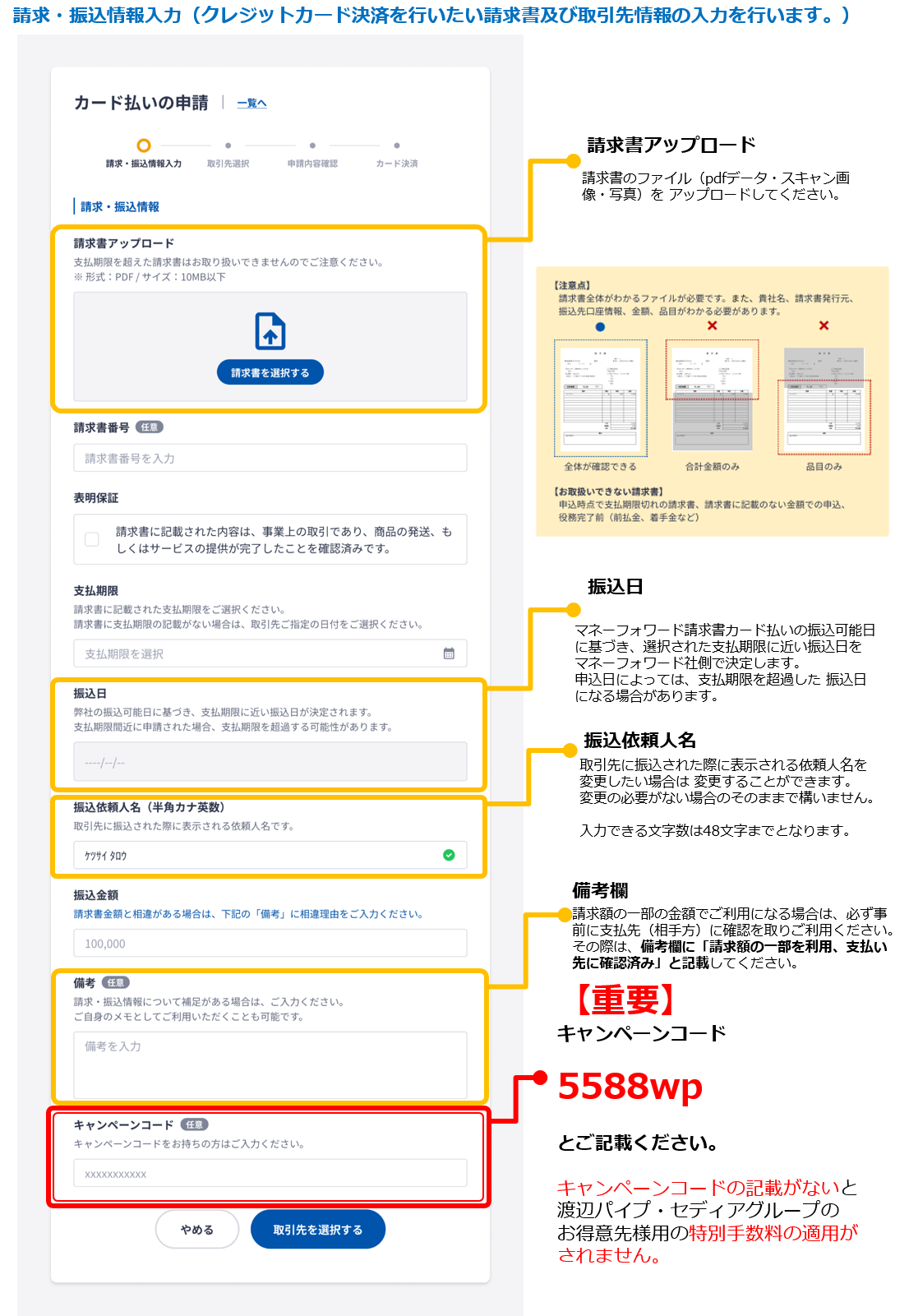 上記キャンペーンコードの記載がないと渡辺パイプ・セディアグループのお得意先様用の特別料金の適用がされません。